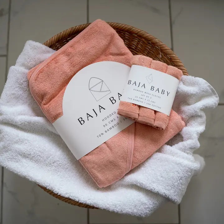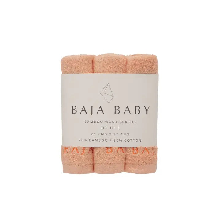 These bamboo/cotton wash cloths are super soft, plush & hypoallergenic. They were designed specifically for delicate skin, just like the rest of the Baja Baby lineup. Whether you're using them for post-meal wipes, bath time, or on sensitive diaper areas, these wash cloths that contain 70% bamboo are sure to provide the most gentle experience possible. Products ship in a 3-pack. Available in Fresh White with Black Logo Lavender Fields with Contrast Logo Sage with Contrast Logo Citrus Fruit with Contrast Logo Don't forget to pair them with a matching oversized hooded towel & care products from the whole Baja Baby lineup! These wash cloths can be washed in the washing machine & tossed in the dryer. No special maintenance required.