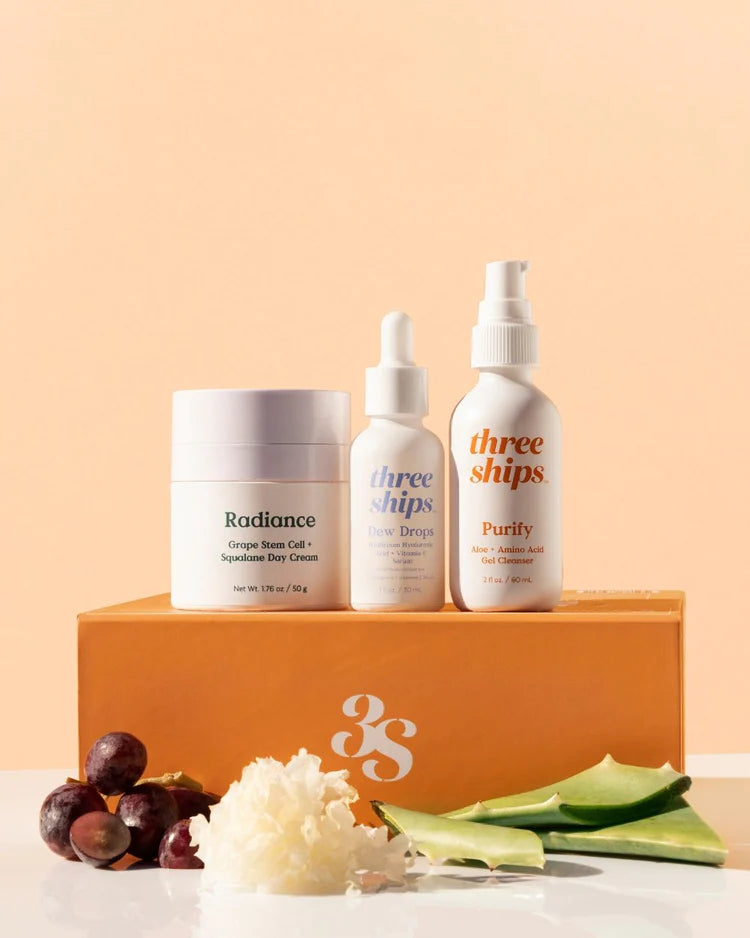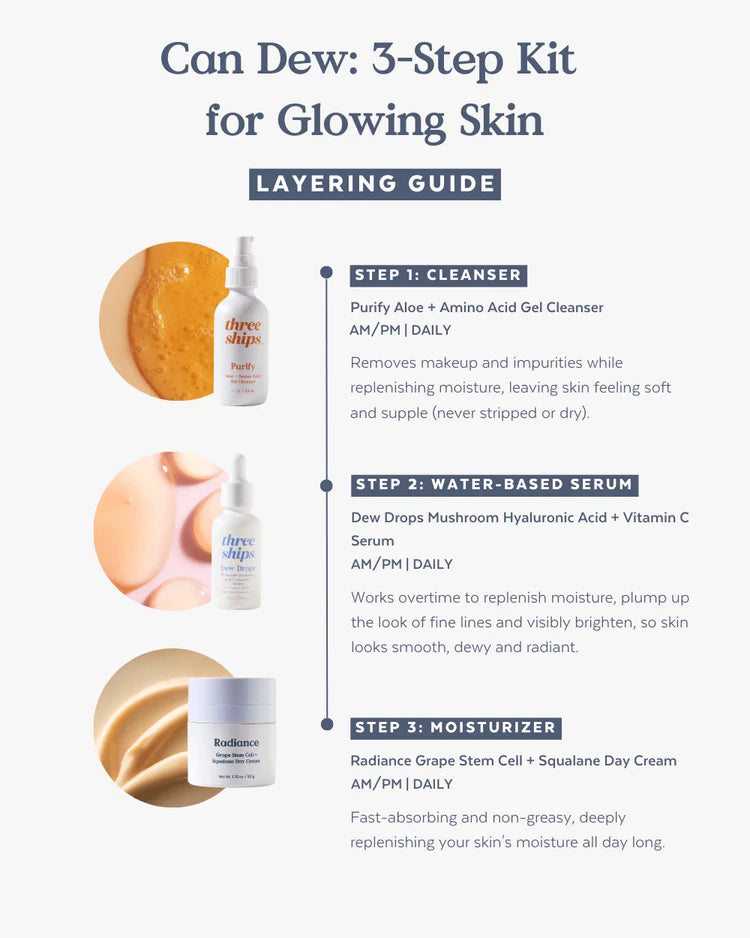 Fresh, dewy, radiant skin in 3 steps? Yes, please! This must-have kit has everything you need for healthy-looking skin. Start with our Purify Cleanser, which melts away excess oil and impurities while supporting skin’s natural moisture barrier. Next up? Our award-winning Dew Drops Serum with tremella mushrooms, a natural source of hyaluronic acid, plus Vitamin C-packed Kakadu Plum to visibly plump and brighten. Finish by locking in moisture with our fast-absorbing Radiance Cream made with sugarcane-derived Squalane. All product full-size.