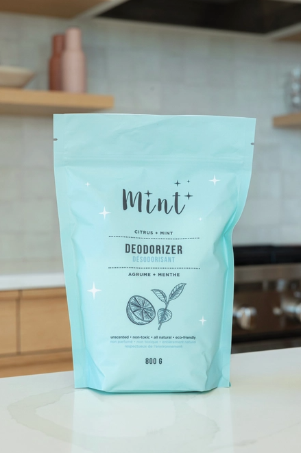 Great for eliminating odors on carpets, couches, mattresses, sinks, garbage bins, etc. Infused with mint and citrus essential oils.