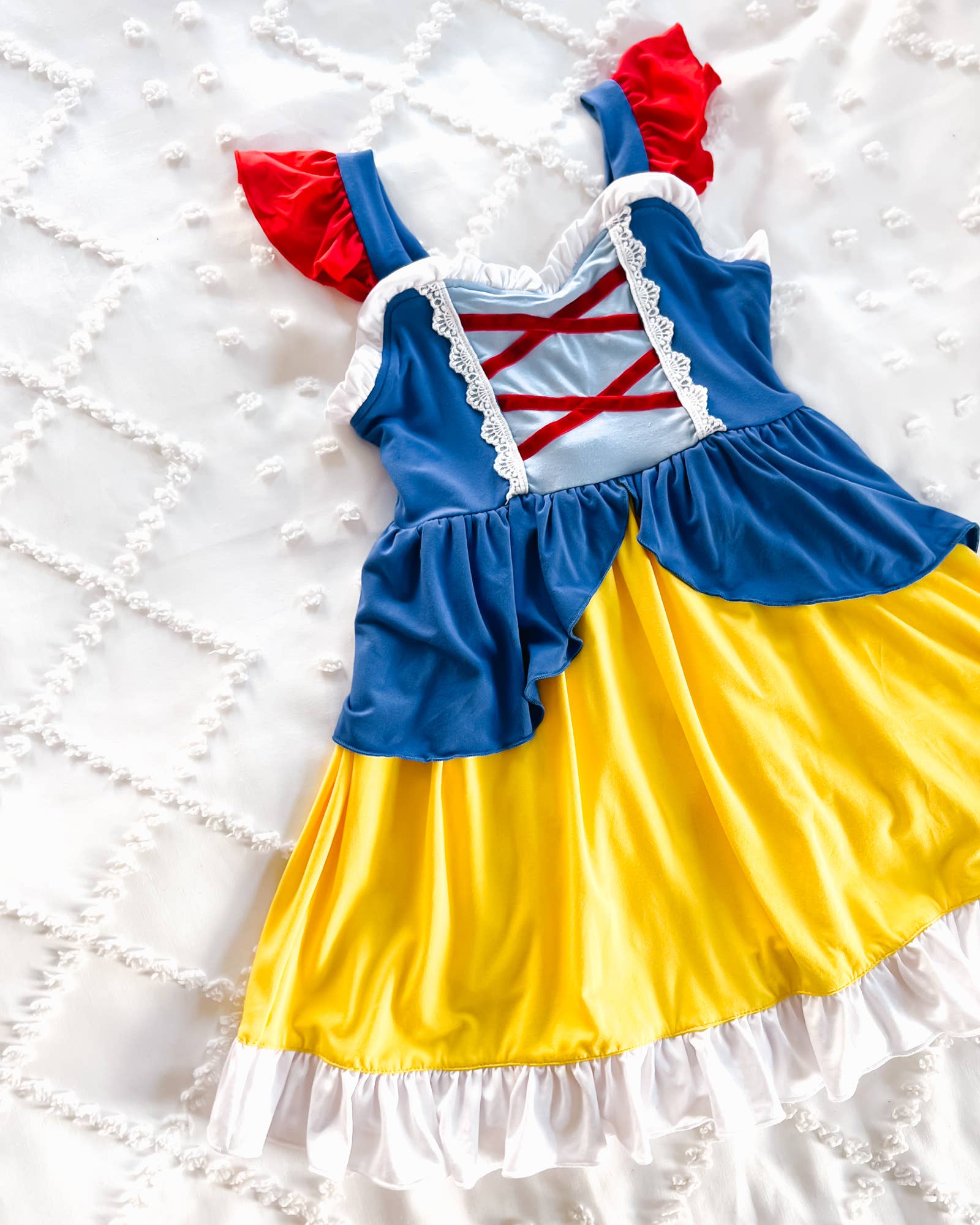 * Bamboo from Viscose Knit, exclusive of details * Velvet Trim and Lace Accent * Flutter Sleeves * Twirl Skirt * Runs true to size *Gentle wash, lay flat to dry.