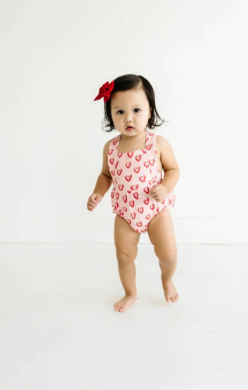 The Isla Romper is super soft and stretchy for little ones who love to move! This print is fun for Valentines and beyond! Featuring ruffled details along the shoulder and over the back, as well as adjustable straps for growing babes. A 3 snap closure makes for easy diaper changes, and the mauve color is a perfect addition to any fall wardrobe. Pairs wonderfully with the Olivia Dress in Happy Hearts