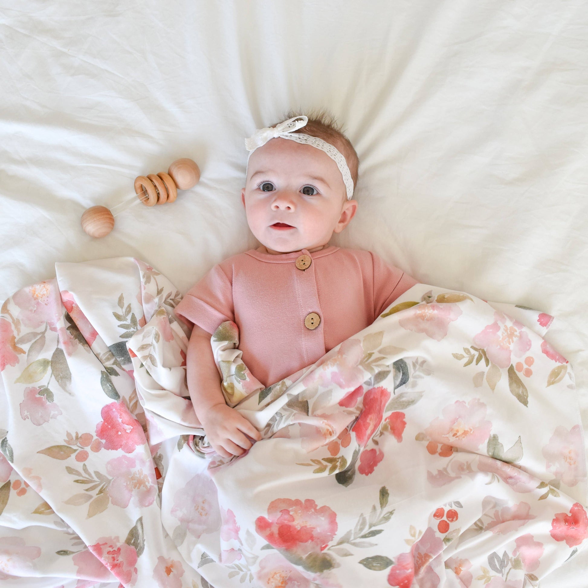 Super large, extremely soft and extra stretchy, this swaddle blanket wraps baby up snug and secure while still allowing just enough wiggle room to not feel restricted! Soft material that is stretchy, breathable and perfect for sensitive baby skin. Extra large size makes it perfect as a receiving blanket or a toddler security blanket. Light weight and breathable for both summer and winter use. Snug fit calms baby, prepares them for sleep, and helps them stay asleep. Beautiful one of a kind pattern, designed by Village Baby. Created by moms, for moms.